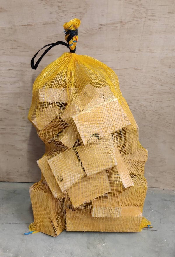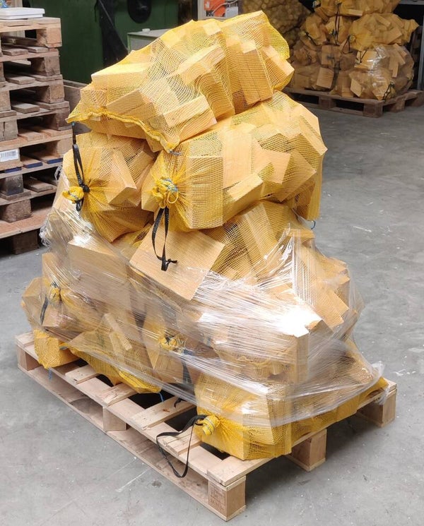 Verpakt in 10 zakken op een pallet, samen goed voor circa 1 kuub hout.