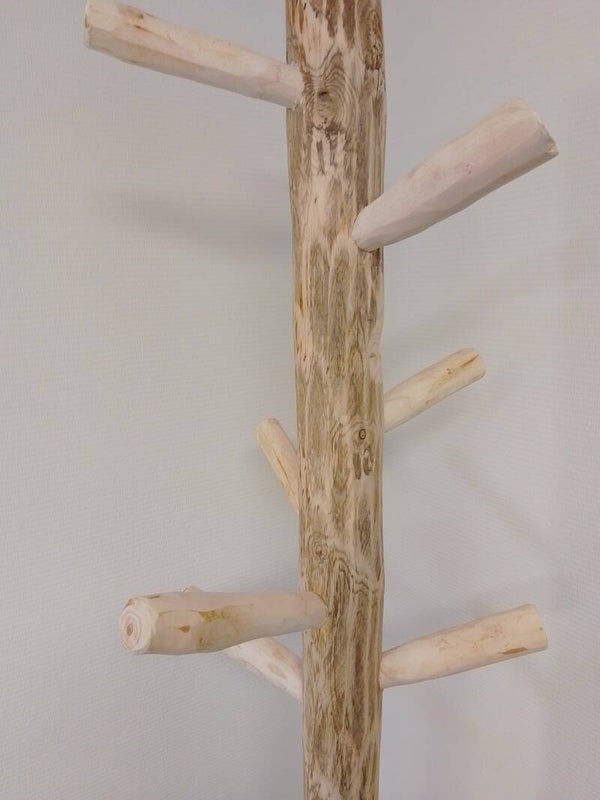 Bovenin zijn korte takken bevestigd die als haken dienen. Zowel de stam als de takken zijn gladgeschuurd voor een splintervrije, natuurlijke afwerking. Elke kapstok is uniek door de vorm van het hout en de plaatsing van de takken.